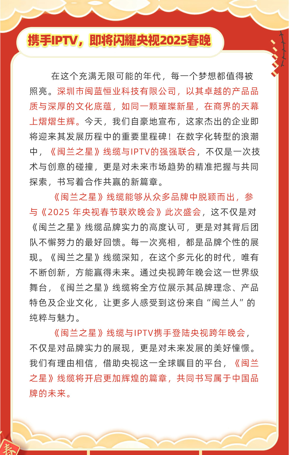 在這個充滿無限可能的年代,每一個夢想都值得被照亮。深圳市閩藍恒業科技有限公司,以其卓越的產品品質與深厚的文化底蘊,如同一顆璀璨新星,在商界的天幕上熠熠生輝。今天,我們自豪地宣布,這家杰出的企業即將迎來其發展歷程中的重要里程碑!在數字化轉型的浪潮中,《閩蘭之星》線纜與IPTV的強強聯合,不僅是一次技術與創意的碰撞,更是對未來市場趨勢的精準把握與共同探索,書寫著合作共贏的新篇章。